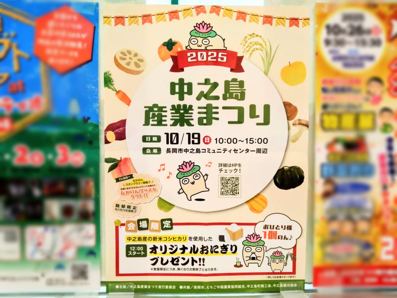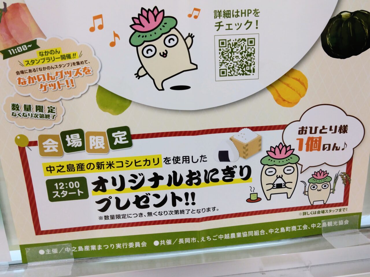 今年も12:00から中之島産の新米コシヒカリを使用した、オリジナルおにぎりのプレゼントもありますよ。(お1人様1個・数量限定につき、無くなり次第終了となります。)