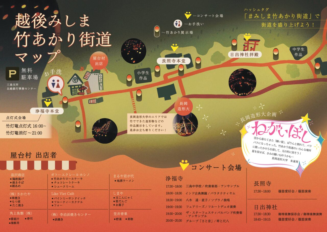 越後三島・脇野町本町通りの風情ある町並み約1kmに、地元里山から切り出した竹で製作された灯籠が配置されます。イベント当日は会場に屋台村も登場します。