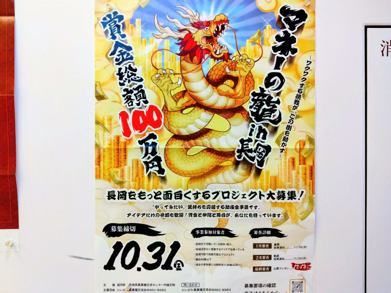 長岡をもっと面白くするアイデア、プロジェクトを応援する助成金事業「マネーの龍 in 長岡 ~ワクワクする挑戦が、この街を動かす~」。こちらの募集締切が2025年10月31日(金)と迫ってきました。