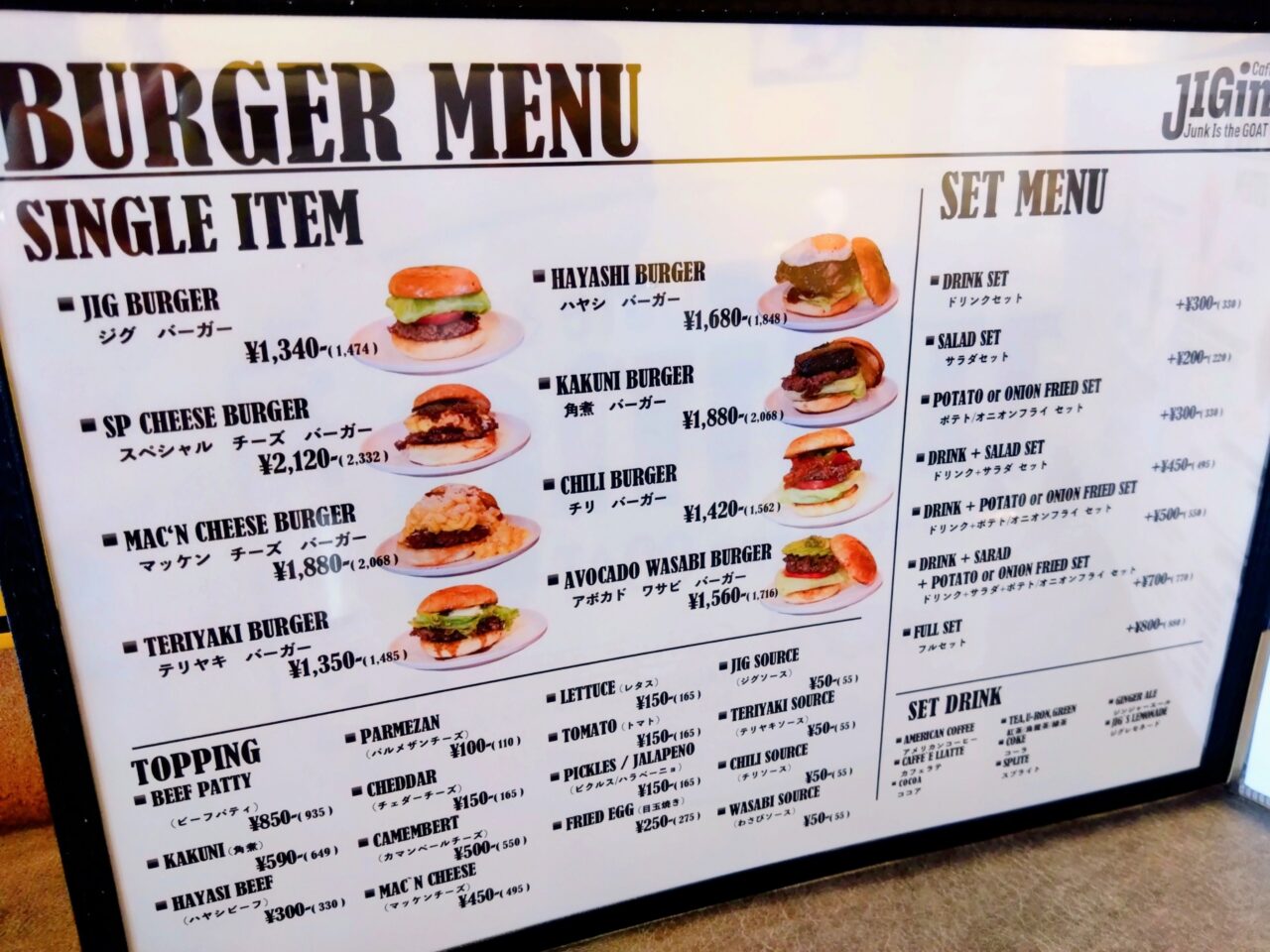 バーガーメニューはベーシックなジグバーガーをはじめ、マッケンチーズバーガーや角煮バーガー、アボカドワサビバーガーなど種類豊富。それぞれのバーガーにはトッピングやセットメニューも選べます。