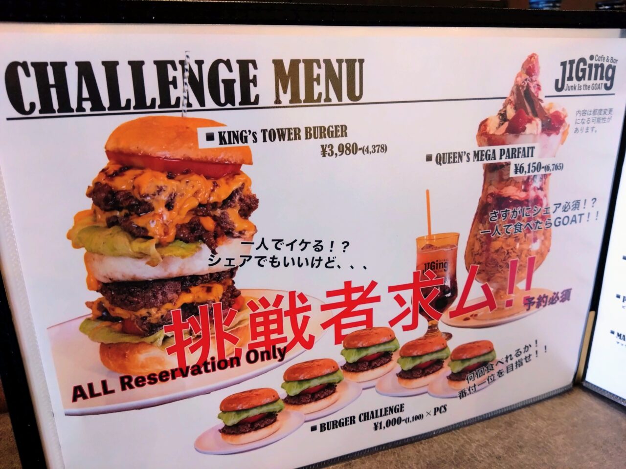 なんとチャレンジメニューも!「KING’s TOWER BURGER(税込4,378円)」「QUEEN’s MEGA PARFAIT(税込6,765円)」は1人はもちろん、みんなでシェアしてもOK。(事前予約必要)