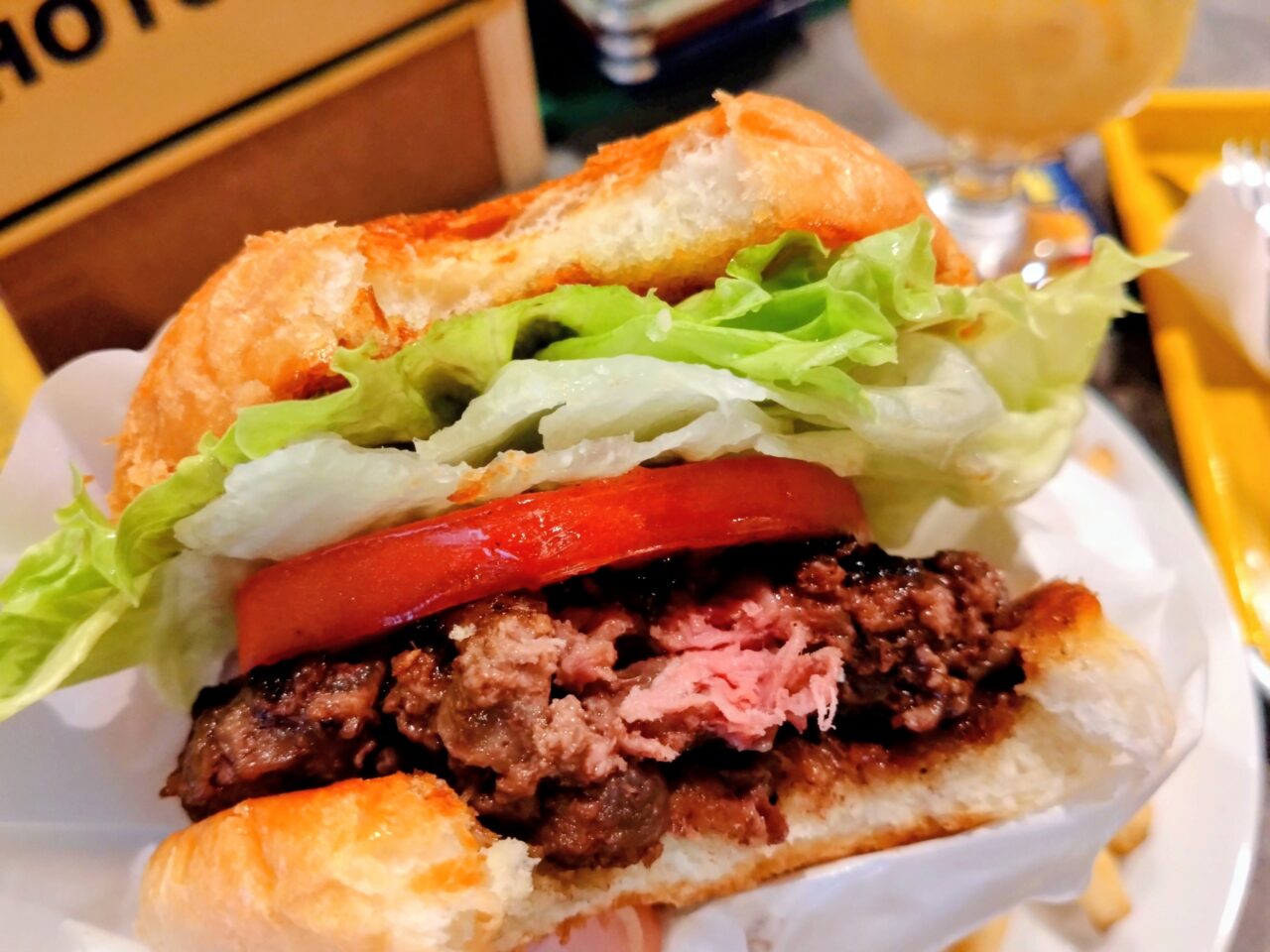 独自配合のパティは和牛100%。肉々しい歯ごたえと食べ応えは、まさにアメリカナイズ! 野菜もたっぷりと挟まれています。
