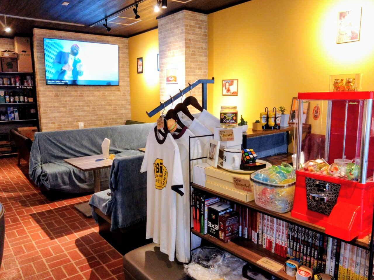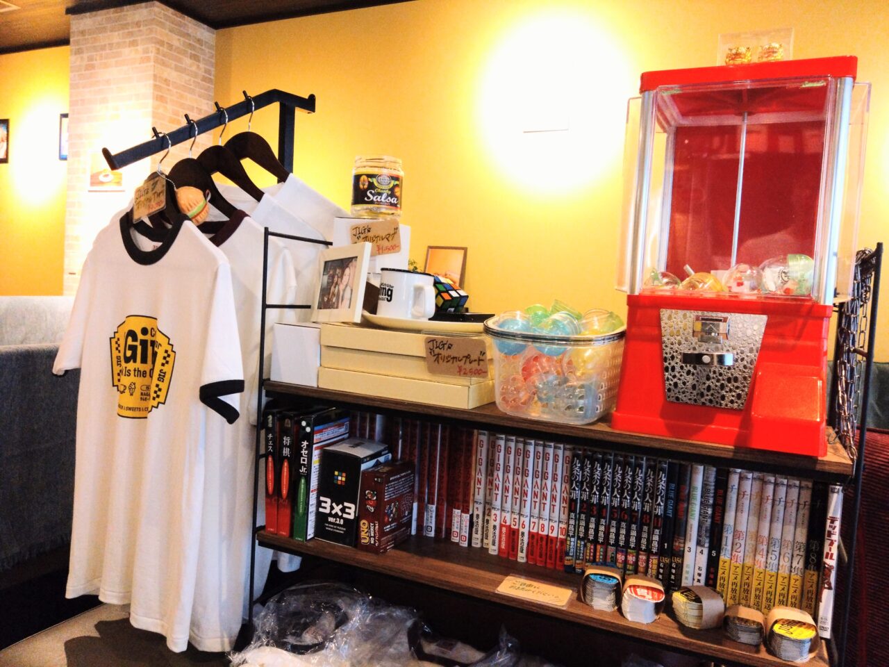 ガチャガチャにお店のオリジナルTシャツも販売されています。オーナーさんの趣味で置かれた漫画も並んでいますよ。