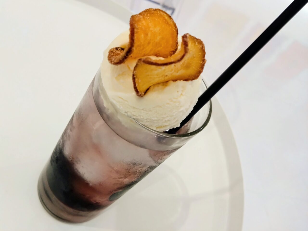 おいもといえば紫…ですが、こちらおいもではなく紫をカシスソーダで表現。甘酸っぱいカシスはアイスクリームとの相性もバッチリです。底にシロップが溜まっているのでしっかりと混ぜてからお召し上がりください。