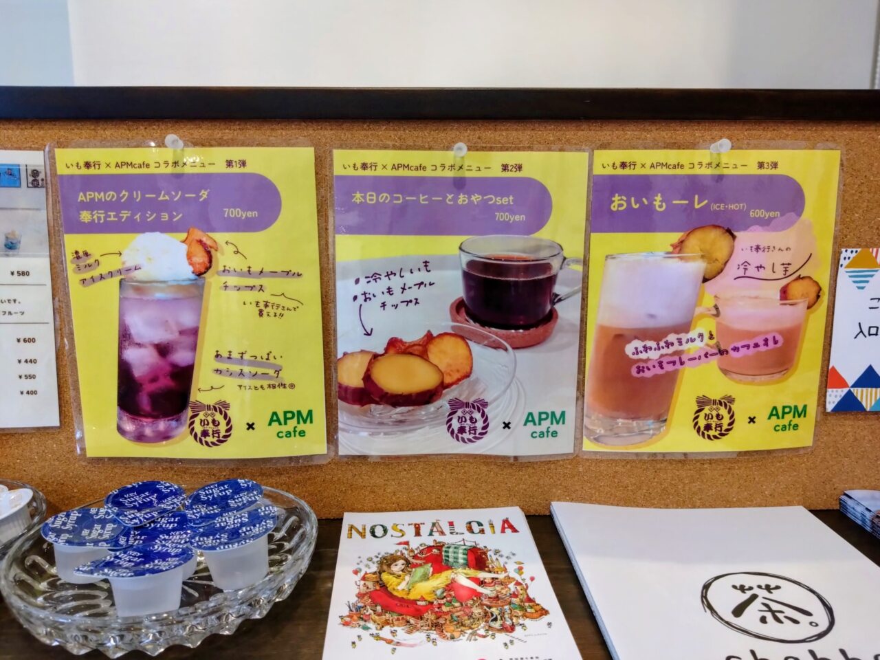 「APMのクリームソーダ 奉行エディション(税込700円)」「本日のコーヒーとおやつset(税込700円)」「おいもーレ(税込600円)」の3種類です。