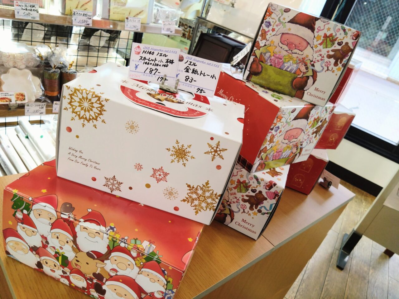 店頭ではやはり時期に合わせてクリスマスものが豊富に並んでいました。ケーキボックスも1枚から気軽なお値段で購入できますよ。