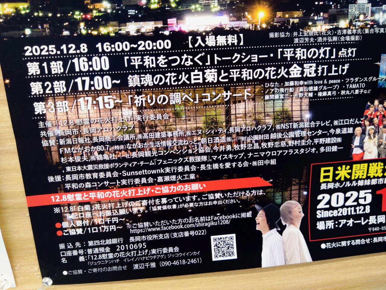 「世界中の爆弾をすべて花火にかえよう!」を合言葉に、戦争犠牲者への鎮魂と平和への願いを込めた花火「白菊」を日米開戦の日に信濃川河川敷で打ち上げます。