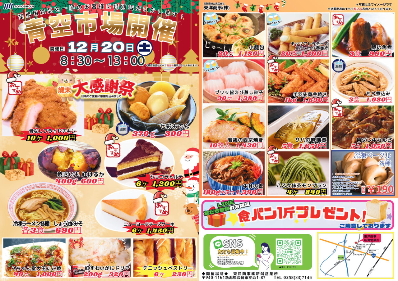 2025年12月20日(土)に業務用食品が誰でも買える、今年最後の「青空市場」が開催されます。開催時間は8:30~13:00です。