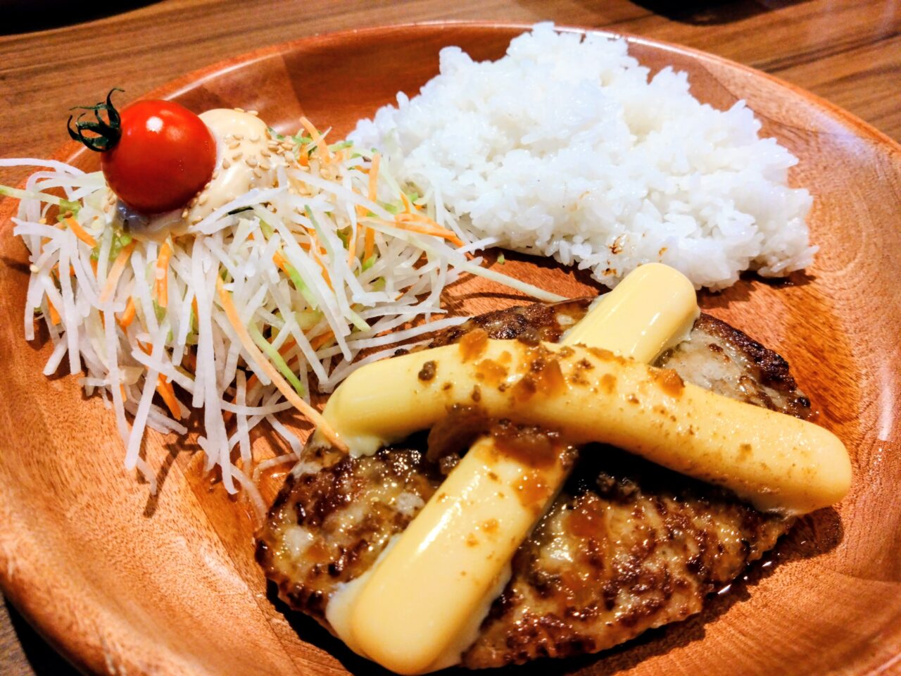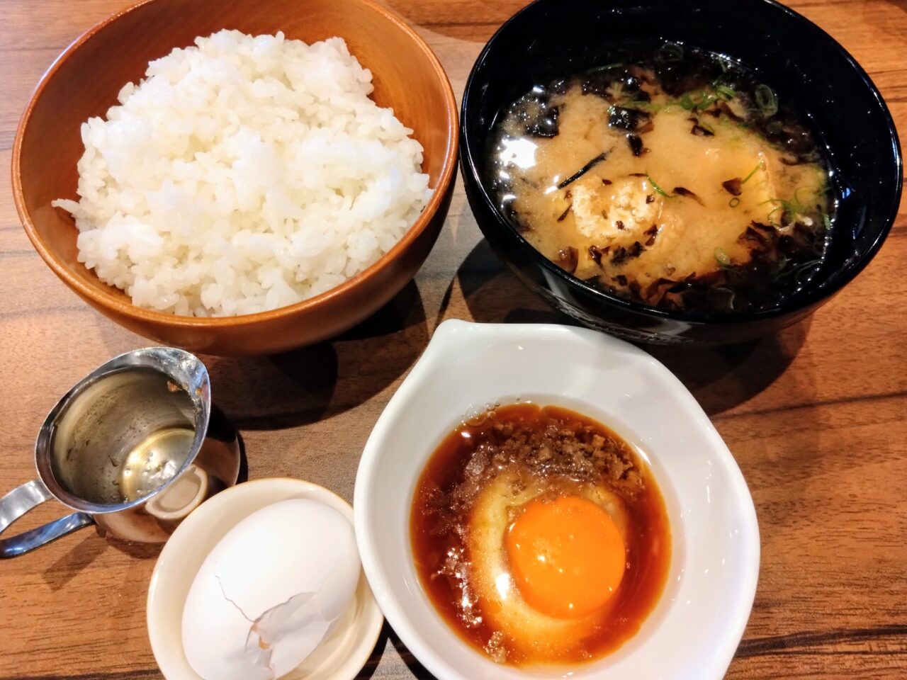 ハンバーグソースで食べる、ここだけの卵かけご飯にはみそ汁が付いてきます。(セットでドリンクは選べないので、追加注文となります。)