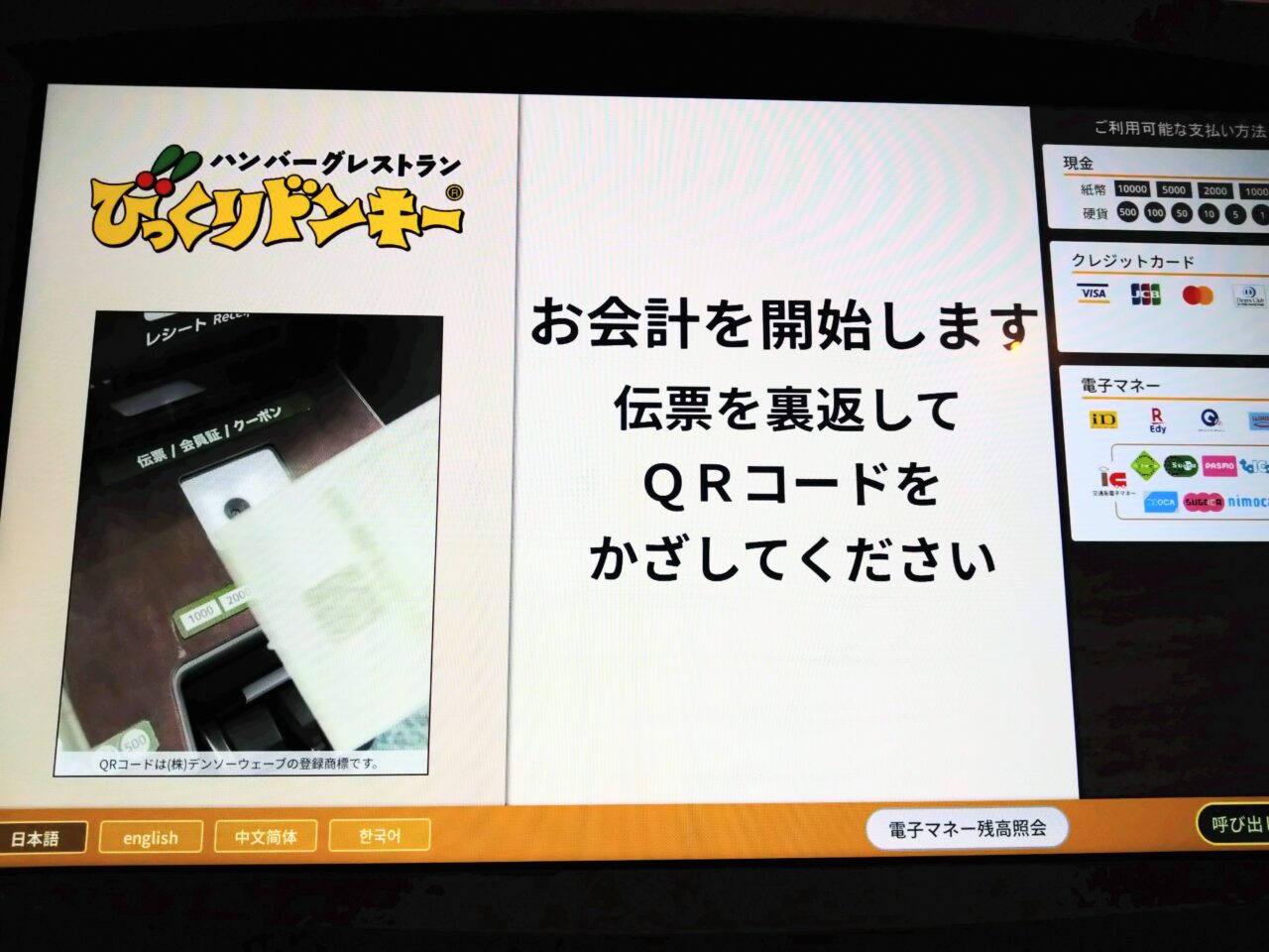 お会計は2台並んでいる「自動精算機」で。画面の案内に従って簡単にできます。現金・クレジットカード・各種電子マネーも使用できます。