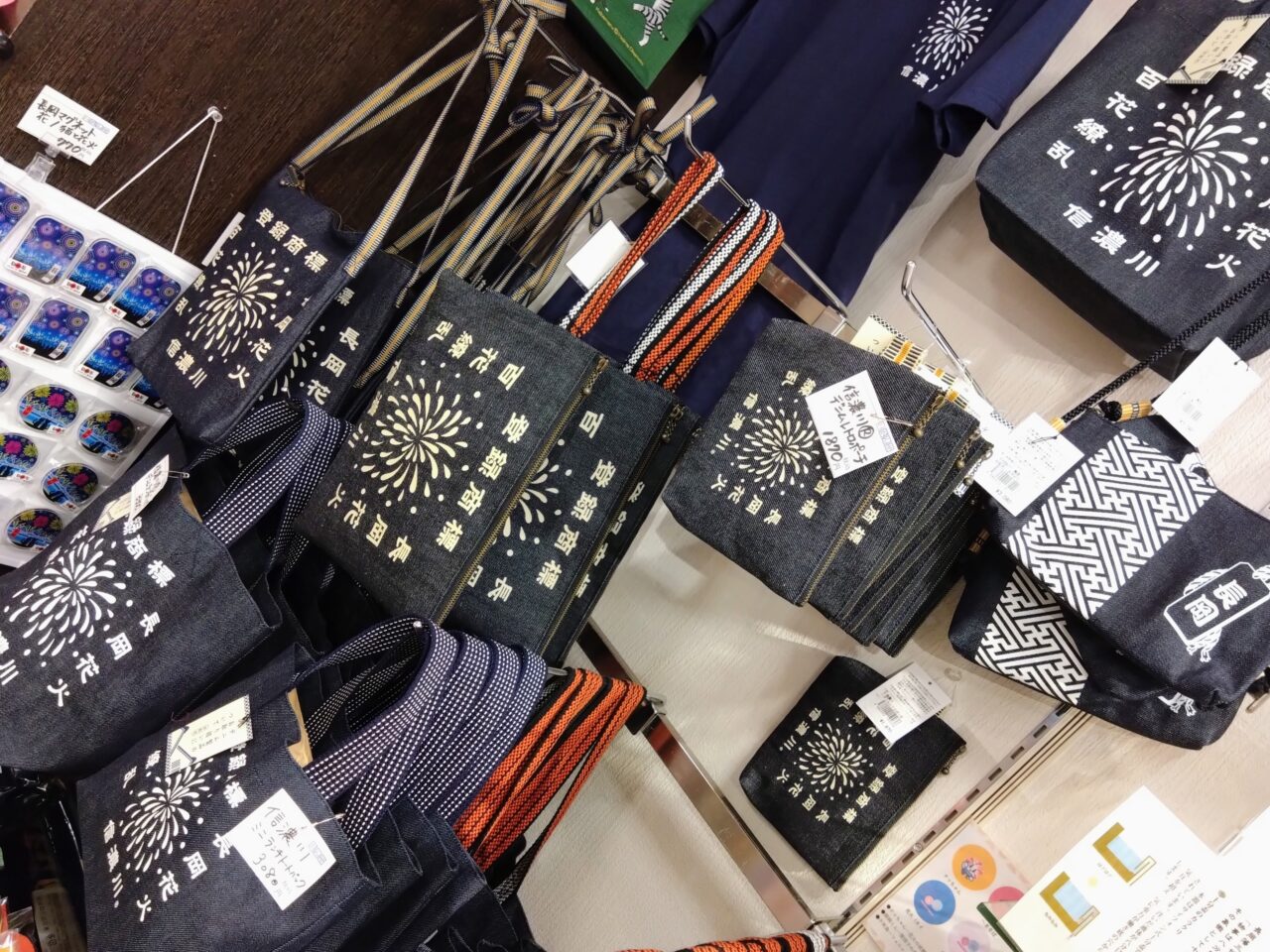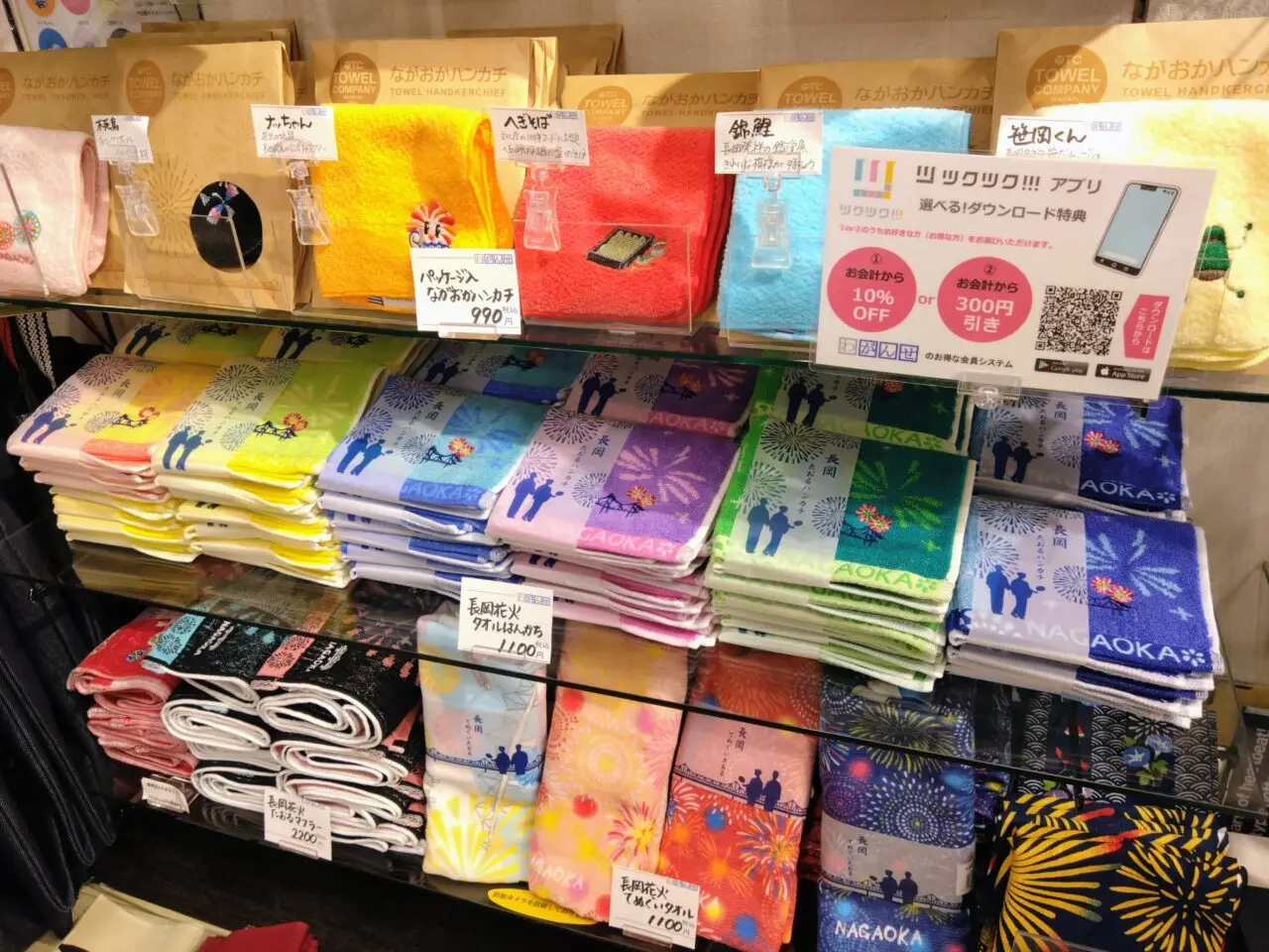 長岡花火をモチーフにした、登録商標「信濃川」のTシャツ・バッグ・扇子などの雑貨も販売しているこちらのお店。