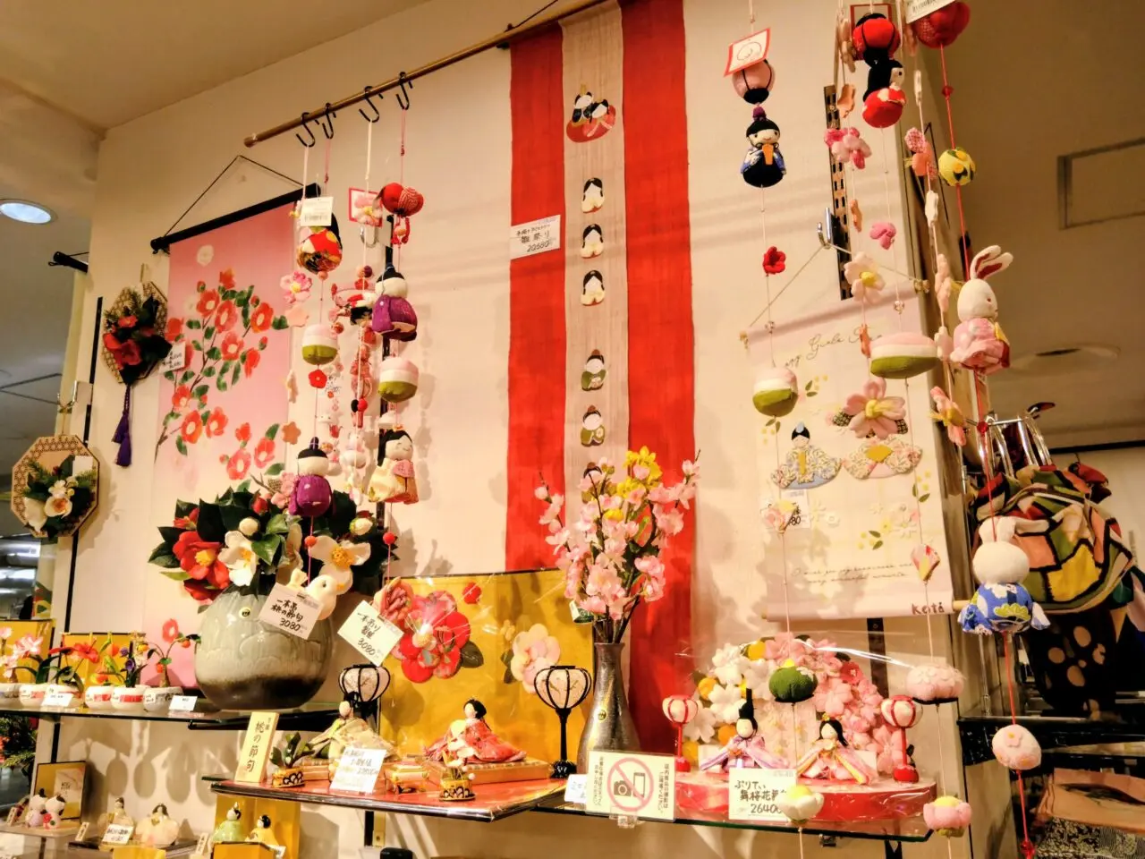 桃の節句に先駆けて、つるし雛などのお雛様も飾られています。