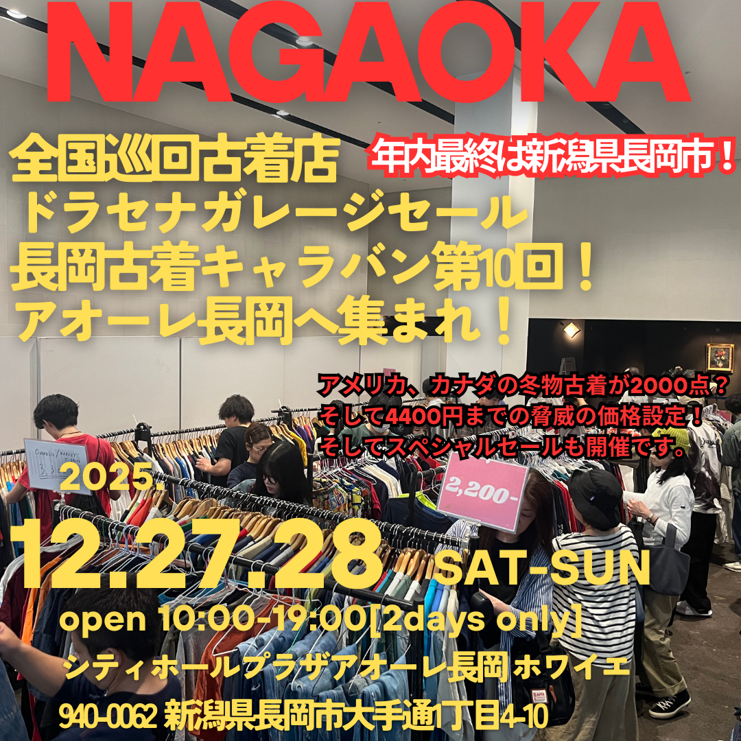 全国巡回古着店の「ドラセナガレージセール」さんによる古着キャラバン。神奈川県相模原から長岡市に大量の古着がやってきます!
