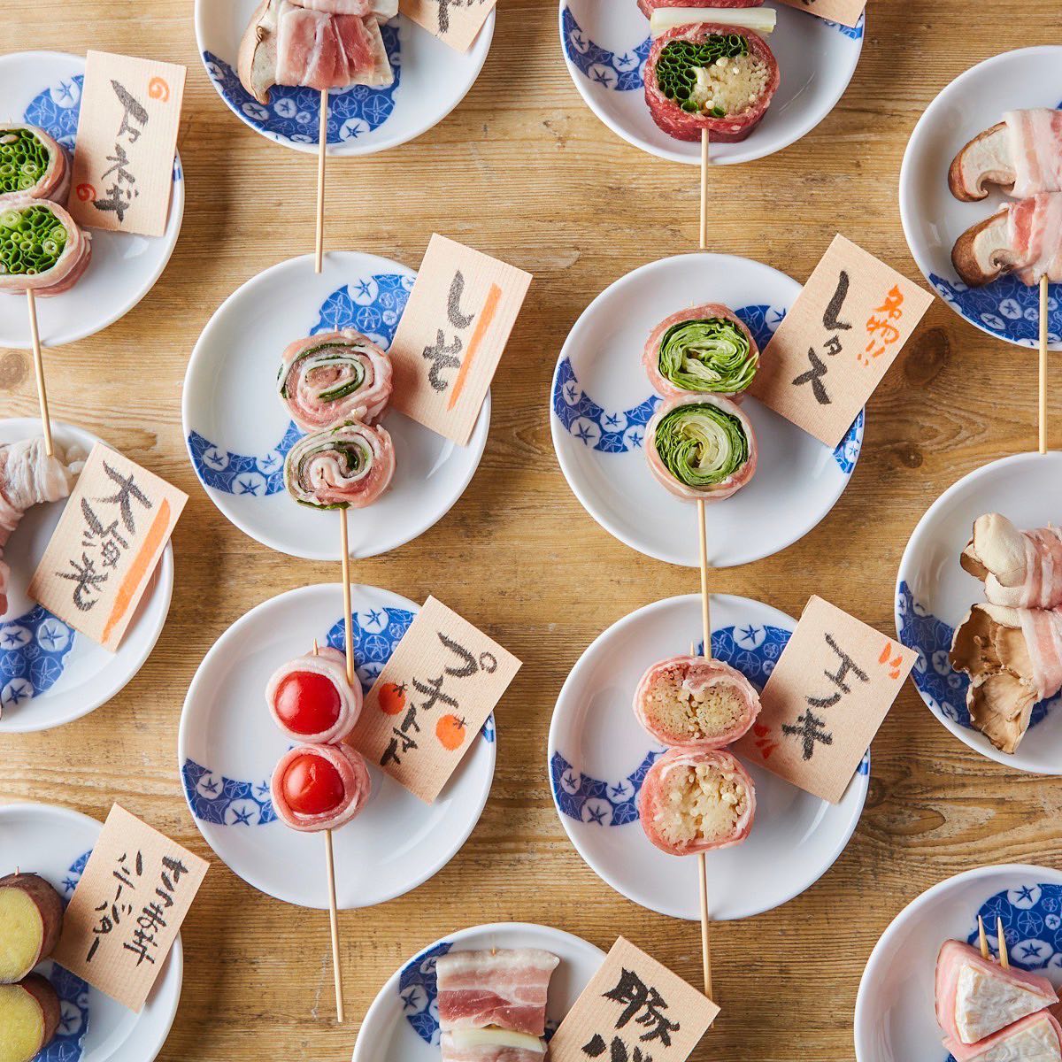 お店の名物「うずまき野菜巻き串」は旬野菜をジューシーな肉でくるりと巻いて、香ばしく炭火でじっくり焼き上げた逸品。