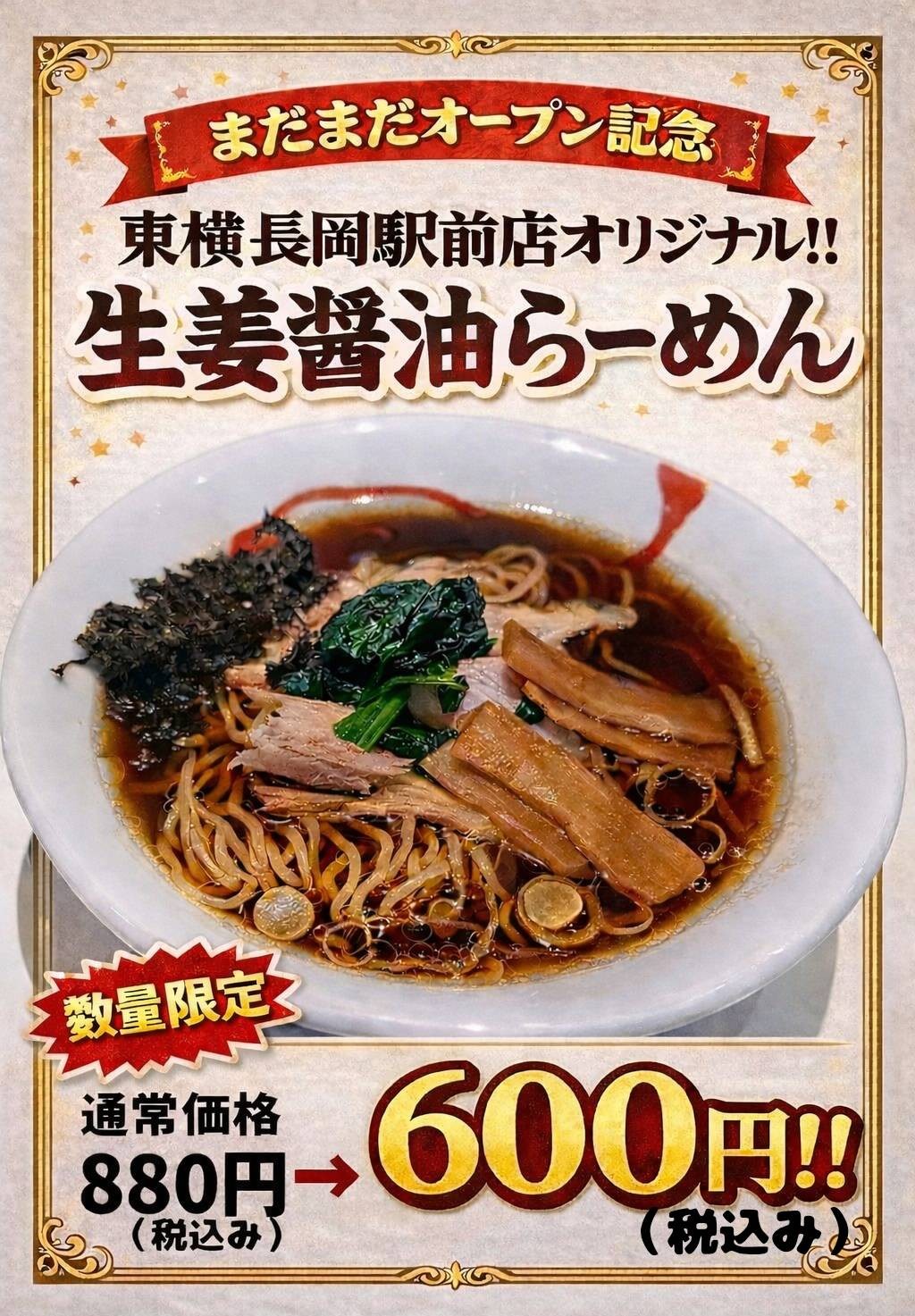 しかしまだまだオープン記念イベントは終わりません! 2026年1月26日(月)からは東横 長岡駅前店オリジナルの「長岡生姜醤油らーめん」が、通常価格なら税込880円のところ、数量限定で税込600円で食べられます!(スープが無くなり次第終了)