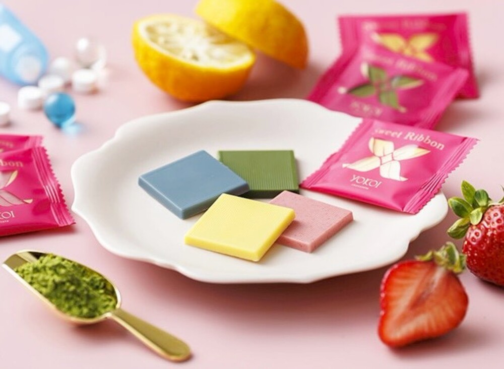 ホワイトチョコレートをベースにいちご・柚子・ラムネ・抹茶の4つのフレーバーを口溶けに仕上げたカラフルな「リボンチョコレート」は、第1弾限定のチョコレート。