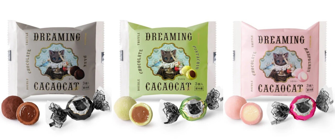 究極のなめらかさのプレミアムチョコレートが人気の「CACAOCAT」からは3種の生チョコが限定販売。「ダーク」「ピスタチオ」「ラズベリー」の3種から選べます。