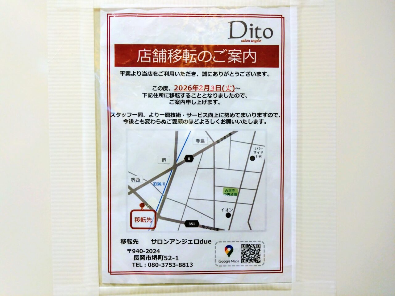 【長岡市】リバーサイド千秋にあった「買取大吉」が2月9日をもってすでに閉店。「サロンアンジェロ Dito」は堺町に移転。