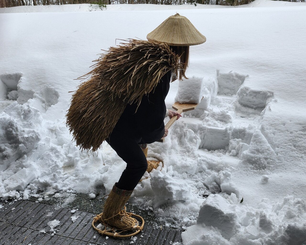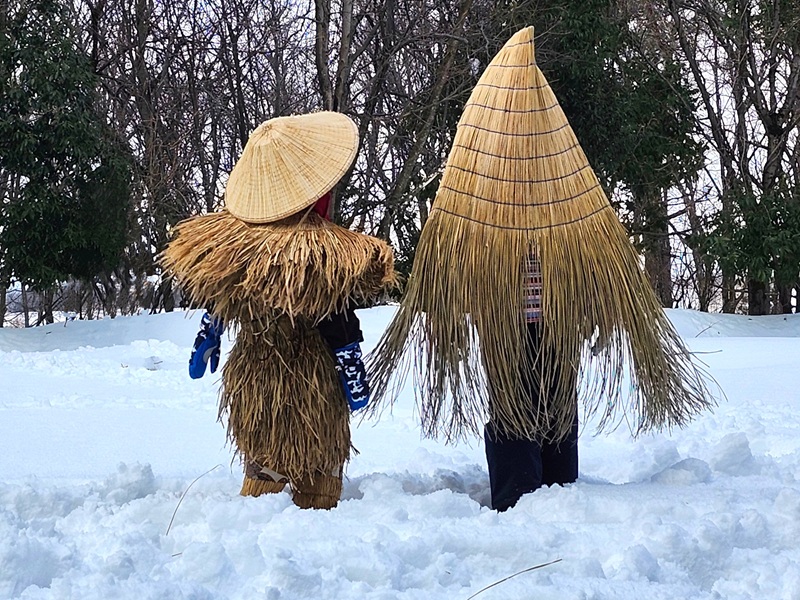 ミノやユキボウシを身に着けたり、コスキやカンジキを実際に使ったりできるプログラム。昔の雪国のくらしを体験してみませんか?(事前申込不要・体験無料)