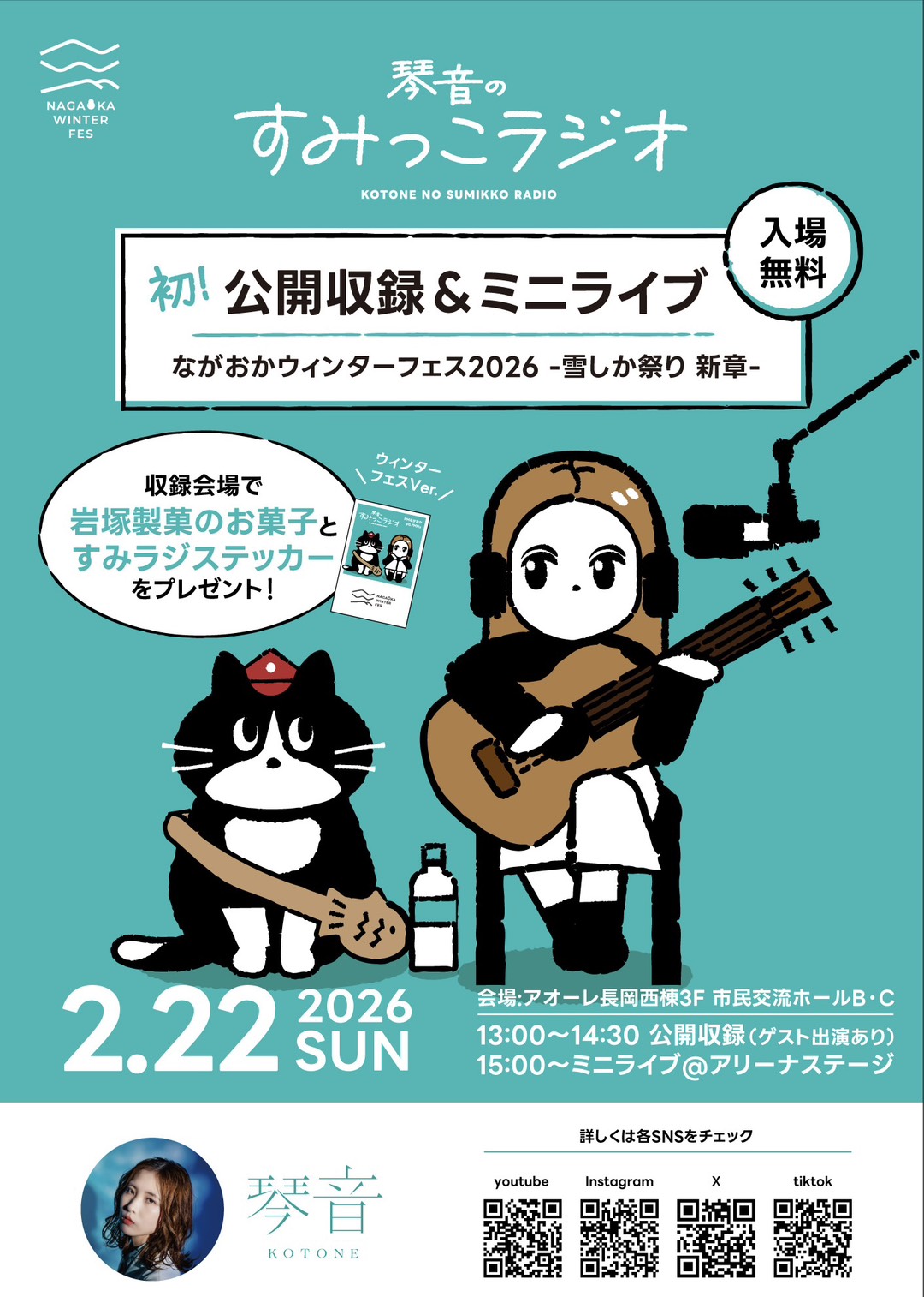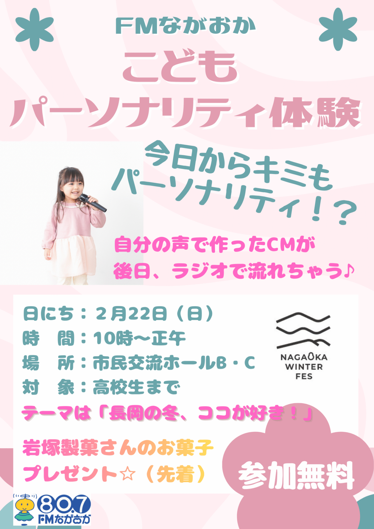 テーマは「長岡の冬、ココが好き!」です。参加者には先着で岩塚製菓さんのお菓子をプレゼント!