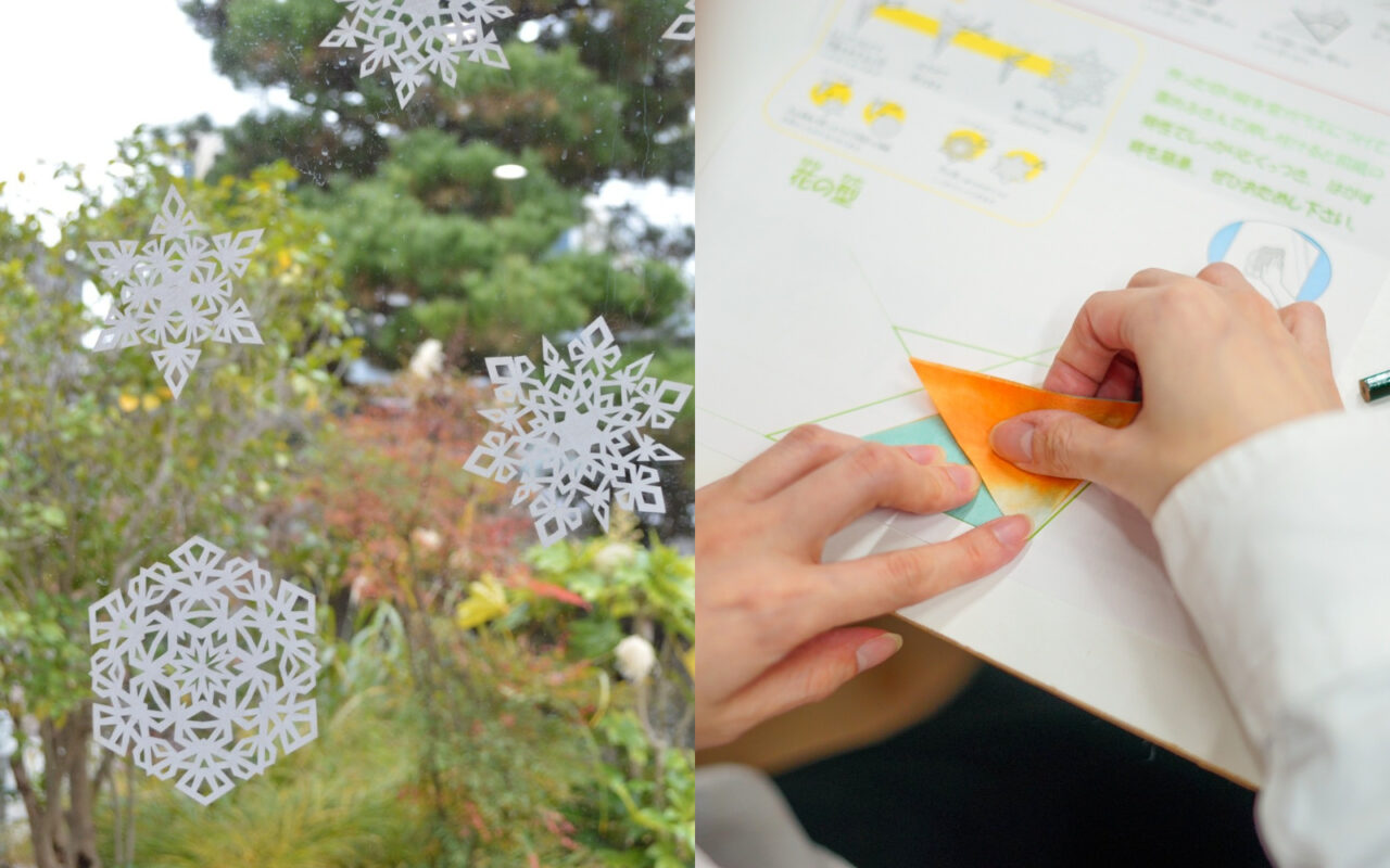 小国和紙を折って、切って、ガラスに貼って楽しめる雪の結晶を作ります。