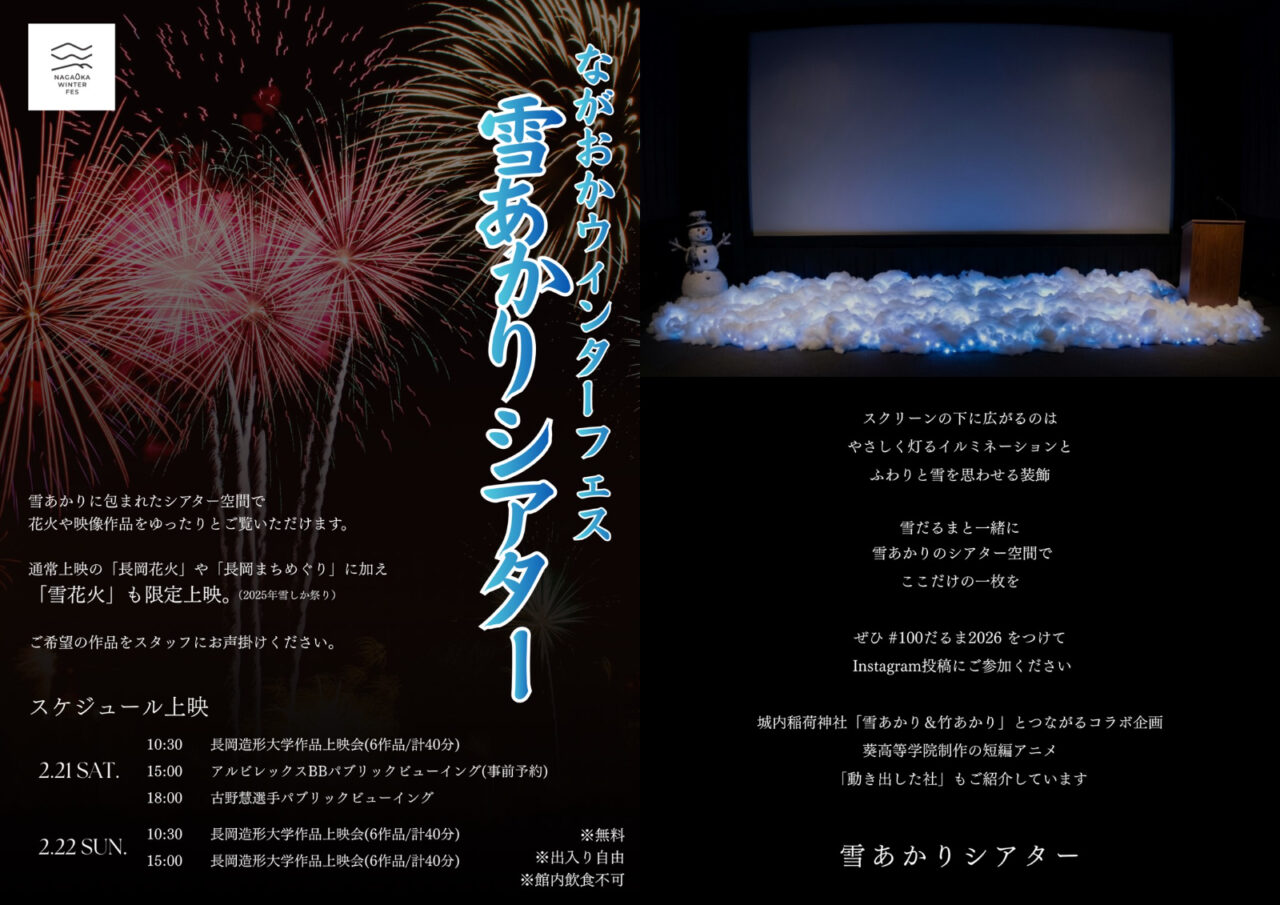 「長岡花火」や「長岡まちめぐり」、「雪花火(2025年 雪しか祭り上映作品)」が限定上映されます。