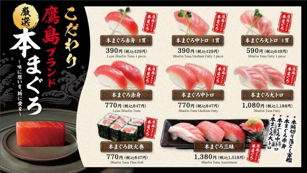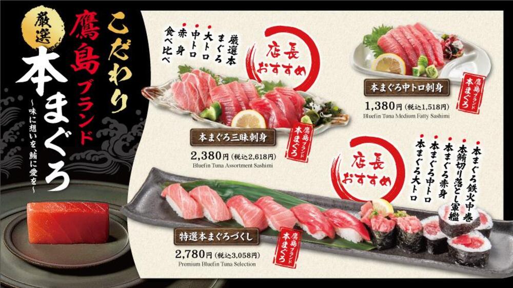イチオシは厳選された、長崎の鷹島ブランド本まぐろ。刺身はもちろん、お寿司で楽しむこともでき、ランチタイムでも楽しめます。