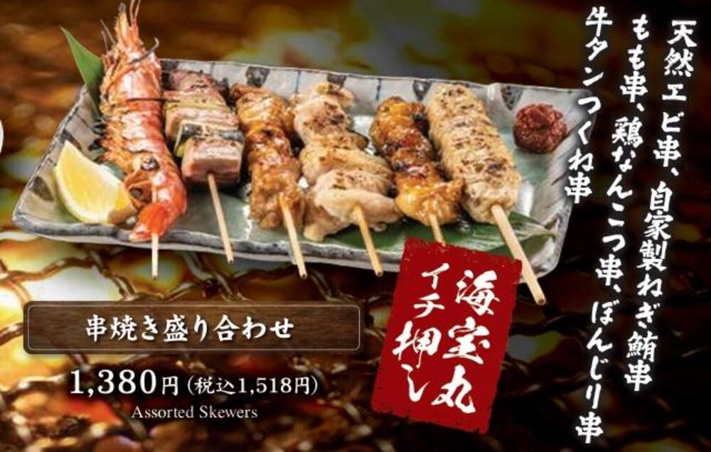 新潟海宝丸 ホテルメッツ長岡店限定のメニューもあり「串焼き盛り合わせ(税込1,518円)」は海鮮からお肉まで幅広く楽しめる一皿です。