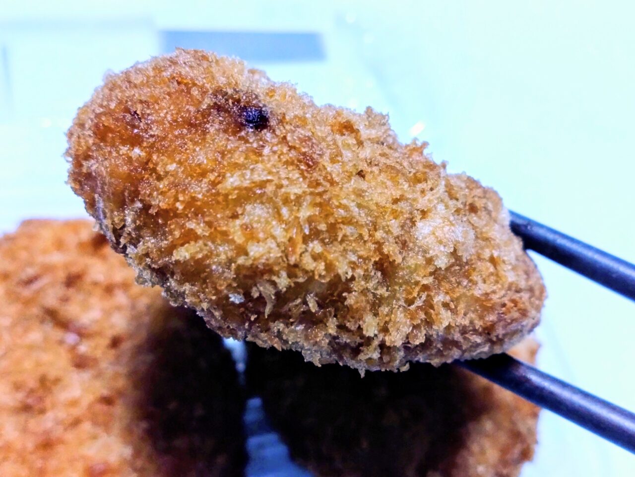 軽くオーブントースターでリベイクしてからいただくことに。箸で持ち上げるのがギリギリなほど重さがしっかりとある、こちらのコロッケを実食!