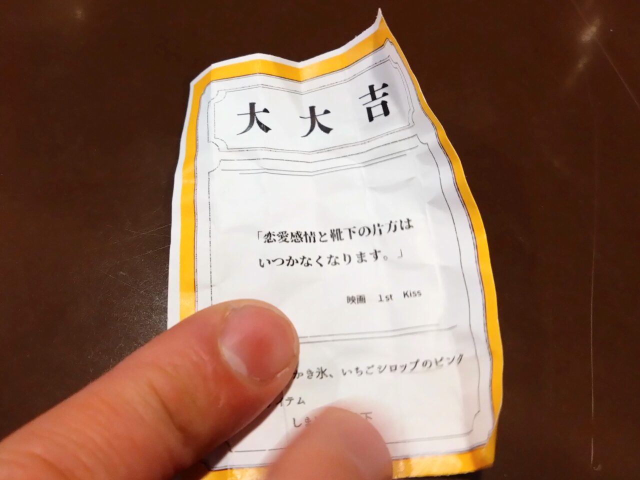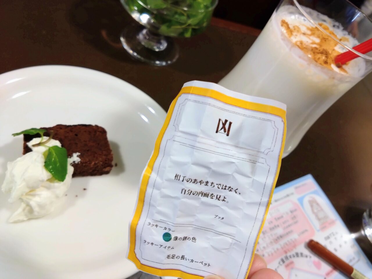 ハートのストロー結ばれたおみくじは「凶」…。ラッキーカラーは「像の錆の色」と個性的。