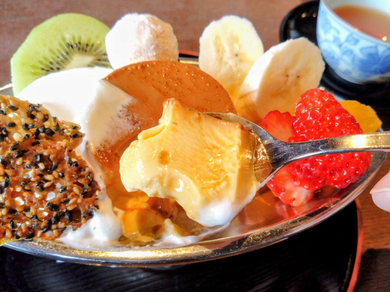 昔ながらのカスタードプリンにミルクアイス、苺、キウイ、バナナ、オレンジ、生クリーム、ごまのチュイール、スノーボールが添えられています。(フルーツが変更になる場合があります。)