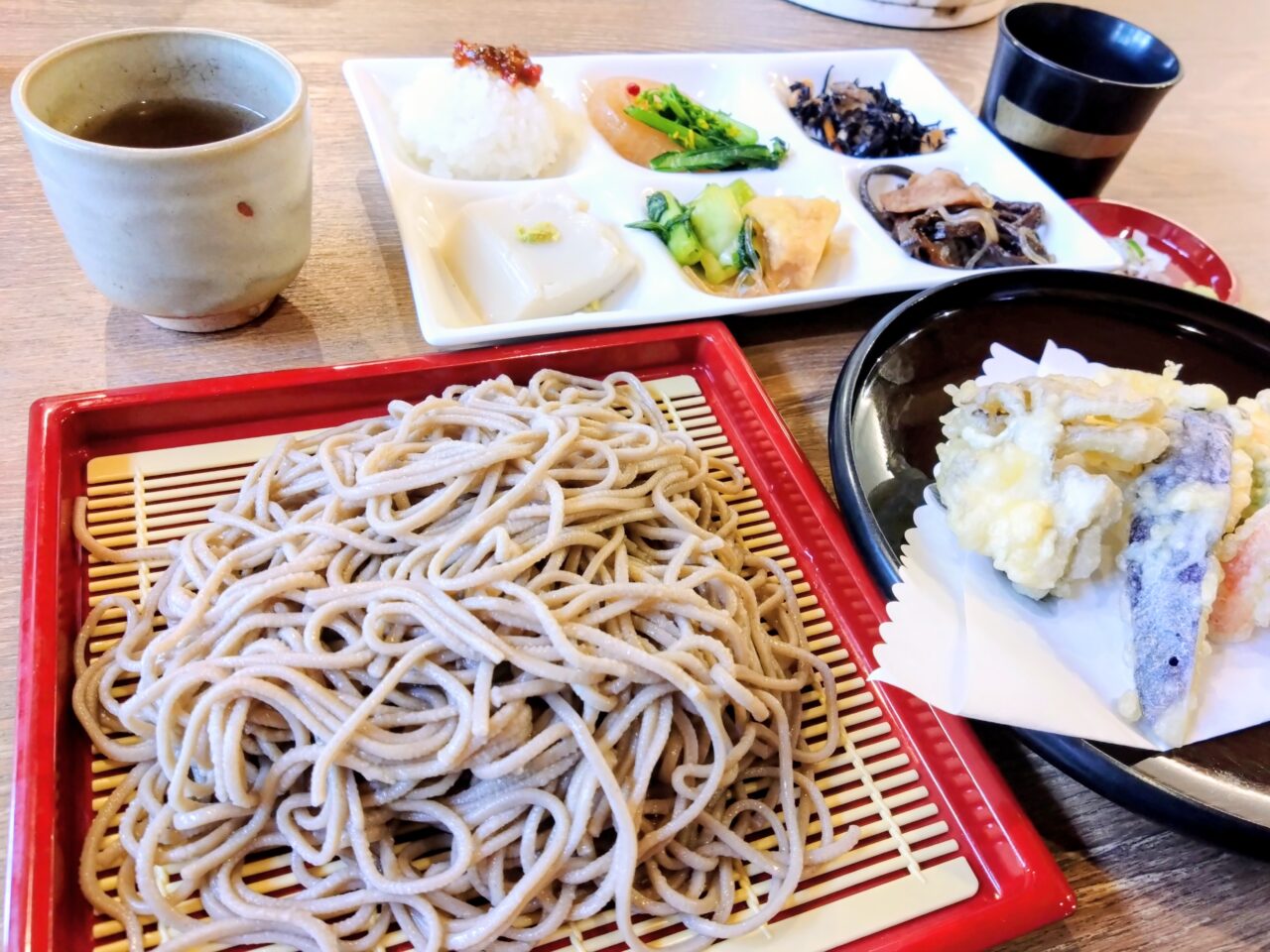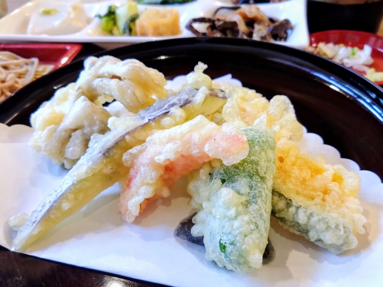 打ちたての板そば(税込1,000円)と揚げたての天ぷら(+税込300円)の相性は抜群。