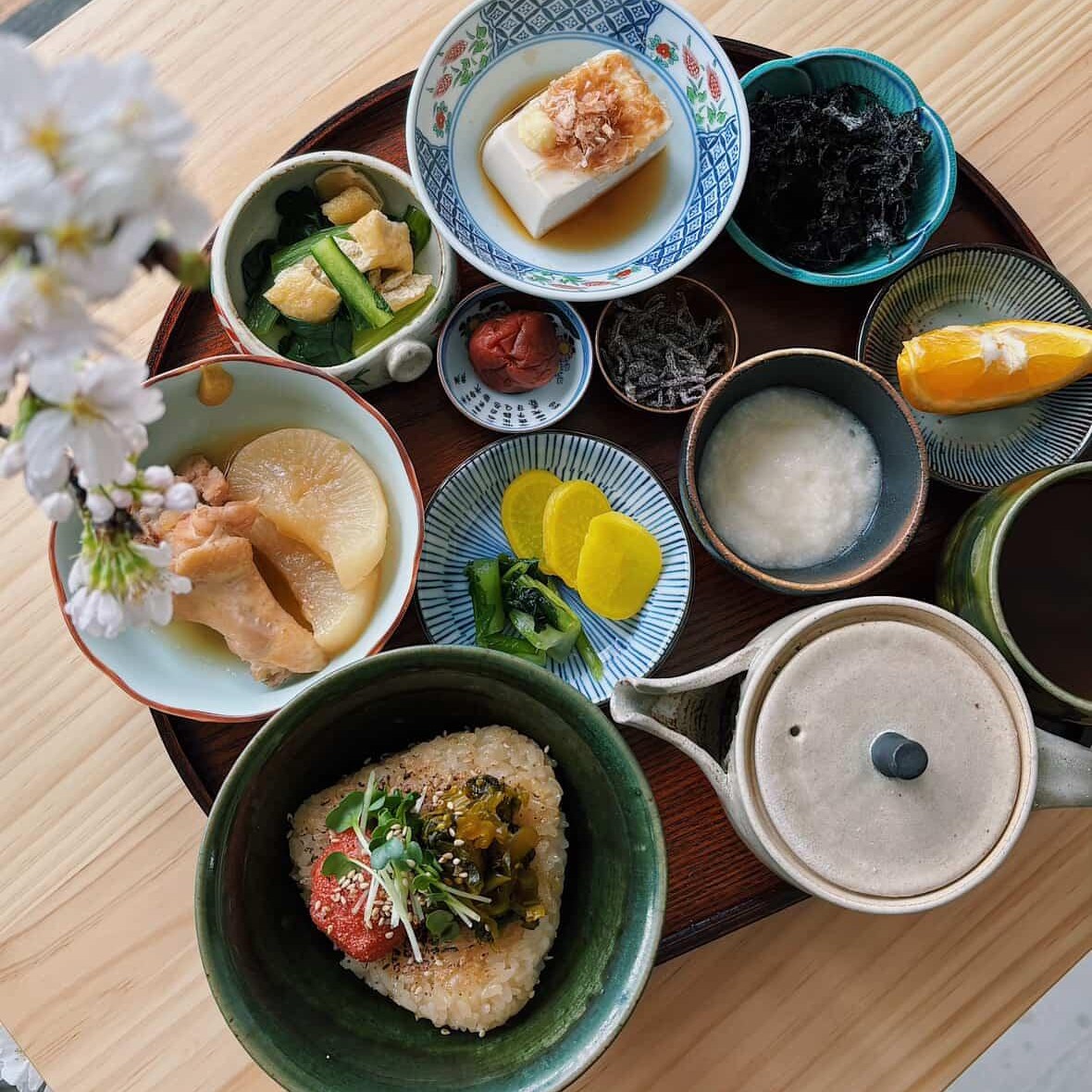 土鍋で炊いたごはんを焼きおにぎりにし、村上茶と一緒にいただく「お茶漬け定食」。定食にはおとうふ、漬物、果物がセットで付いてきます。さらにおばんざいが2種類付く「おばんざい膳」がおすすめですよ。