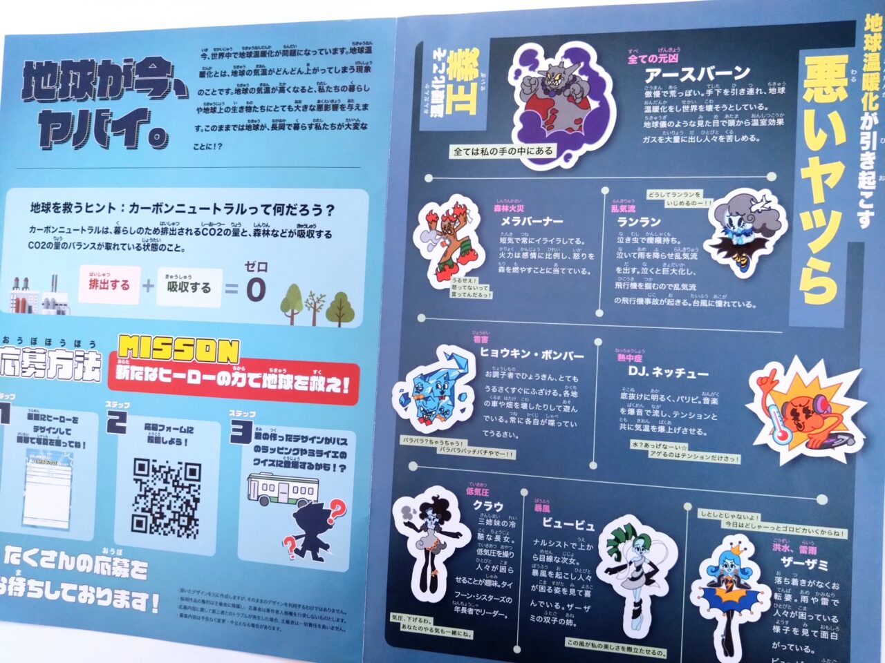 地球温暖化を引き起こす「悪いヤツら」と称して悪役のキャラクターはすでにチラシに掲載されています。その悪役に対してヒーローを考えるという、小学生でも理解しやすい構成となっています。