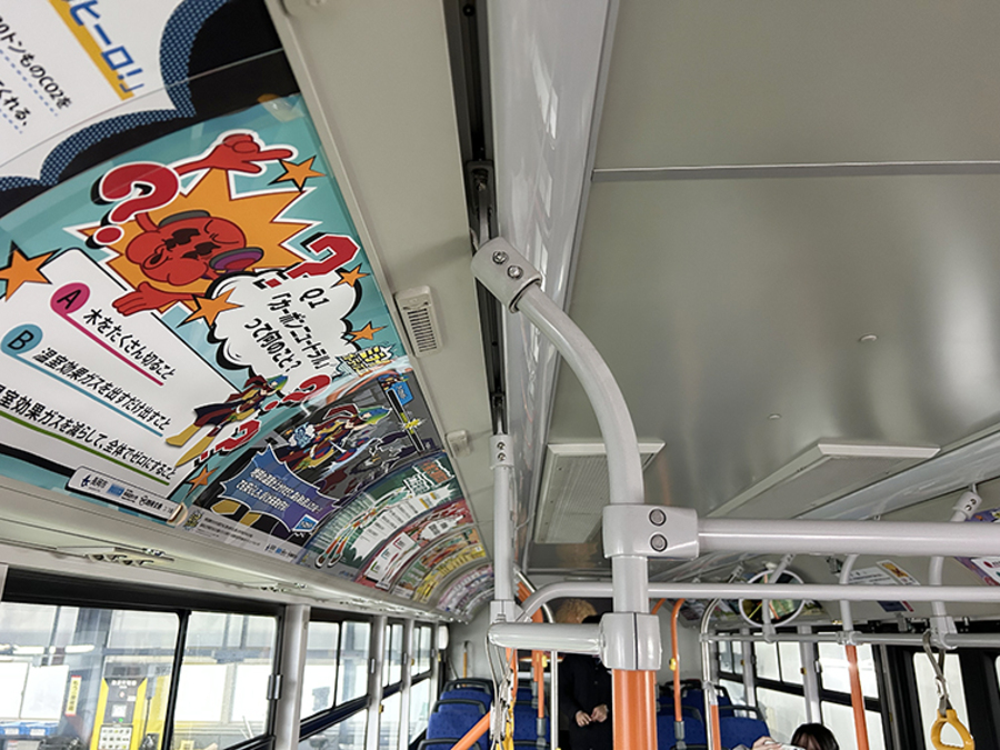 車内ではキャラクターの紹介や、カーボンニュートラルについて学べるクイズなどのポスターが掲示されています。