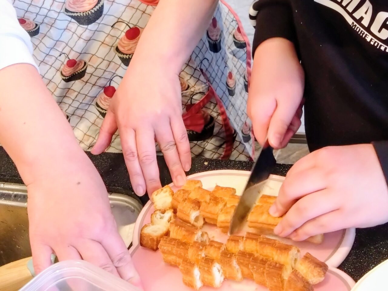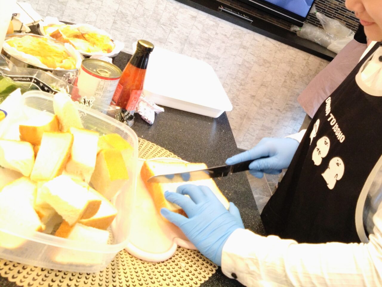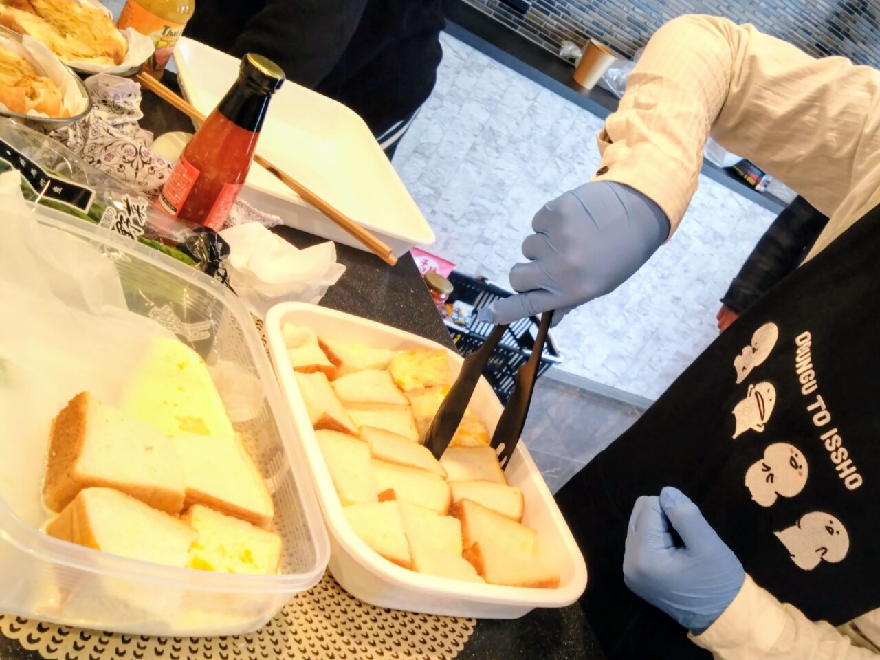 こちらの小学生はフレンチトーストの仕込み中。卵液に浸ける食パンをひっくり返すのに苦戦していました。