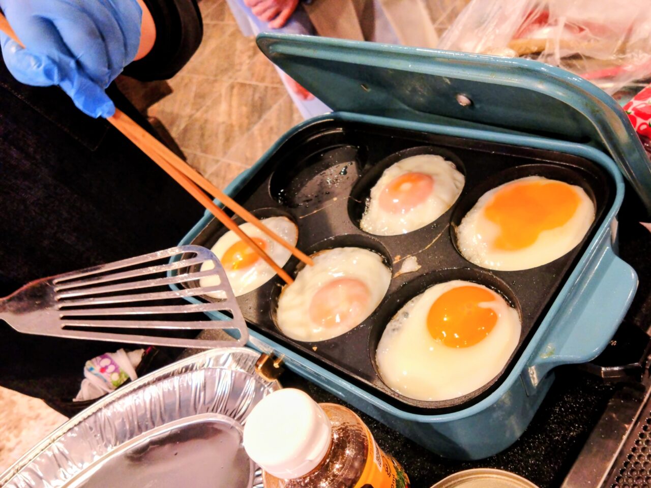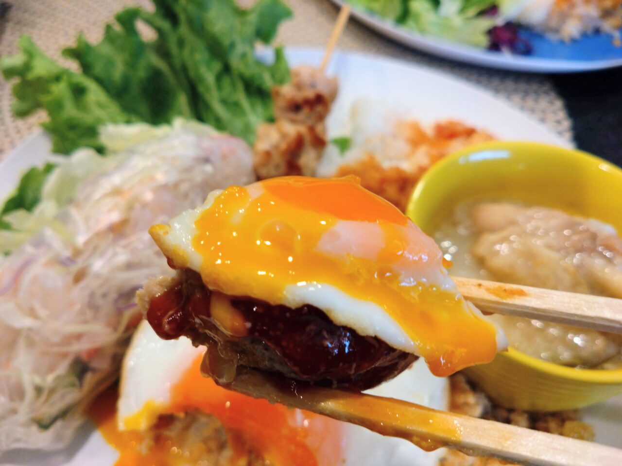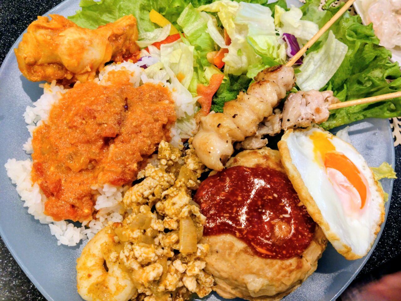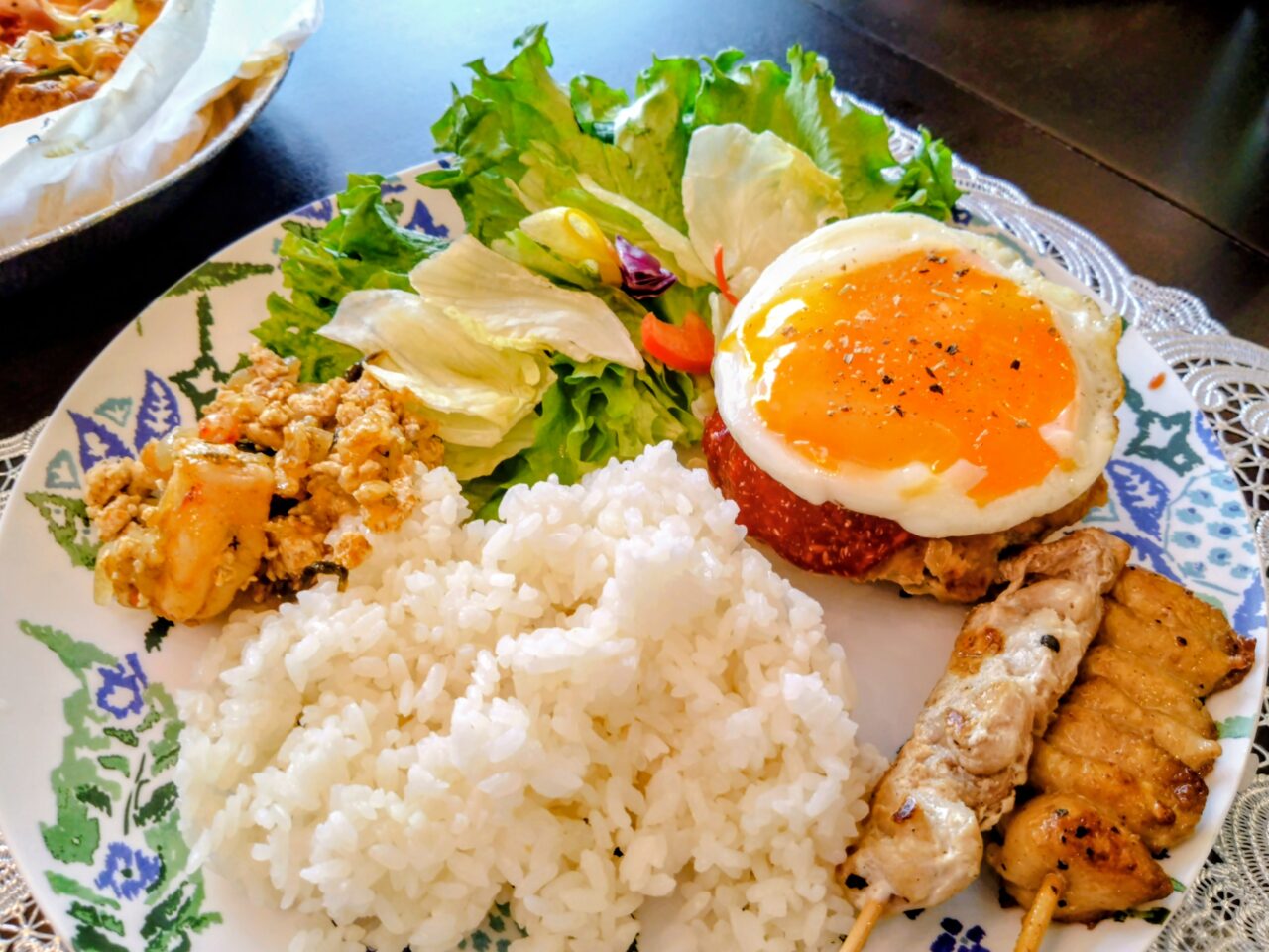 自分たちでオリジナルのスぺシャルプレートを作っていきました。ロコモコのほかにも看板メニューのガパオライスや、鶏肉に甘辛いソースを塗った「サテ風」の焼き鳥なども。