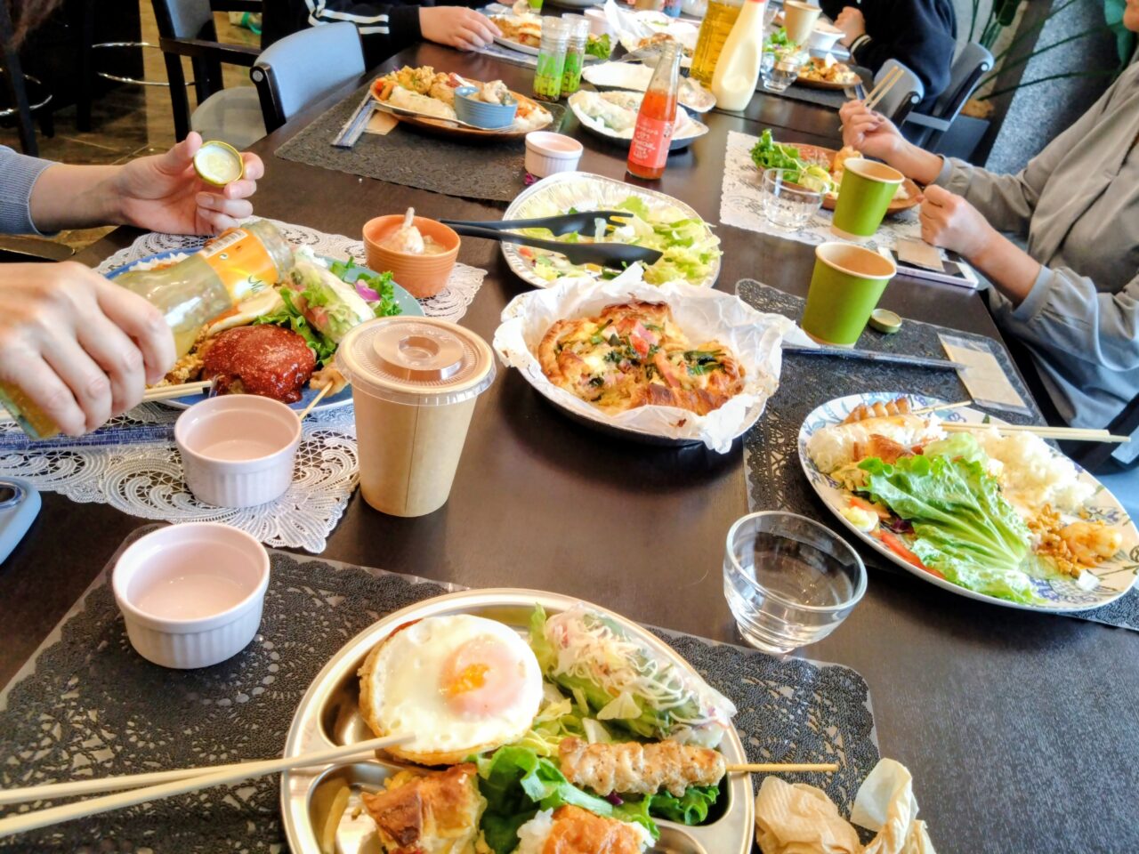 「おいしいね」「お店が楽しみだね」と笑顔の会話が飛び交う真ん中には、タイや中国やフランスにハワイ、韓国などさまざまな国の料理が並びます。