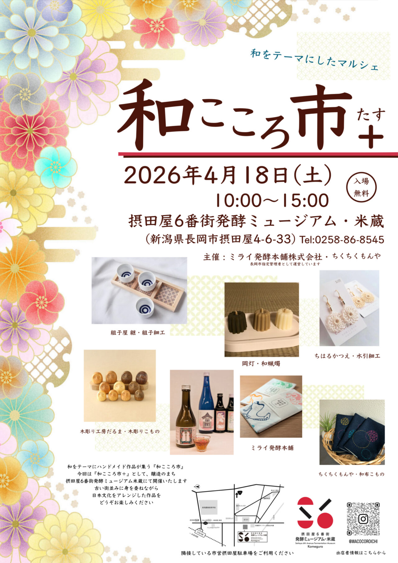 摂田屋6番街 発酵ミュージアム「米蔵」では、「和」をテーマに日本の素材や技法、伝統を活かしたハンドメイド作品が集うマルシェ「和こころ市+」が開催されます。