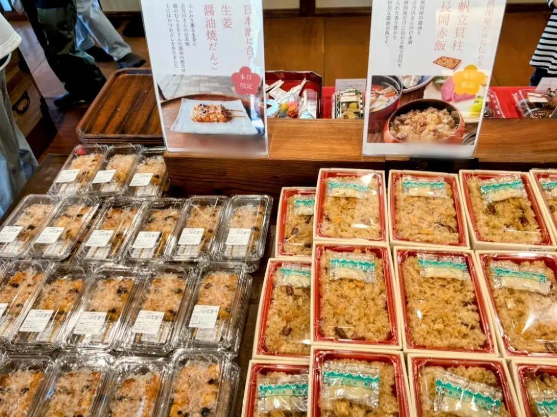 江口だんご 摂田屋店では、吉乃川の日本酒と星野本店・越のむらさきの醤油で味付けした、摂田屋に伝わる「帆立貝柱赤飯」の限定販売も。
