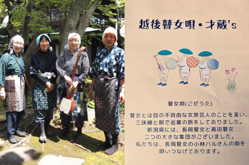 最後の瞽女と呼ばれ、人間国宝の認定を受け三条市の名誉市民でもある小林ハルさんの直弟子、継承者の竹下玲子氏から指導を受けた須藤れい子氏が2018年に結成した「越後瞽女唄 才蔵’s」の演奏もあります。