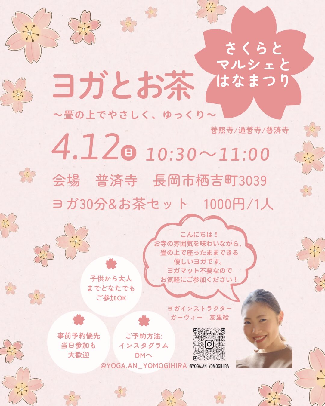 普済寺では10:30~11:00に、ヨガインストラクターのガーヴィー友里絵さんによる優しいヨガと田中清助商店さんのminiお茶飲み比べ講座が開催されます。ヨガマットは不要、親子で気軽にお申し込みください。事前申込みはDMで。当日参加もOKです。(参加費:1,000円/1人)
