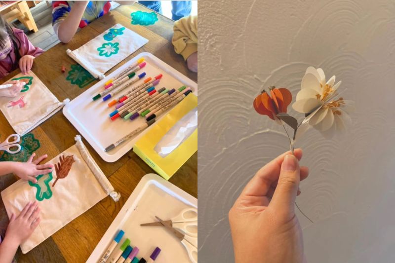 ぬりえきんちゃくバッグやペーパークラフトのワークショップ。草木をモチーフにしたペーパーインテリアを制作しています。