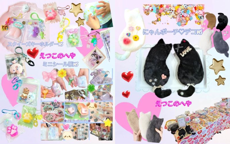 大人気の「ミニシール帳ワークショップ」「スクイーズキーホルダーワークショップ」「ねこポーチデコワークショップ」「シールバイキング」などお子さんが楽しめるものがたくさん。ハンドメイドから国内外のセレクトアイテムも並びます。