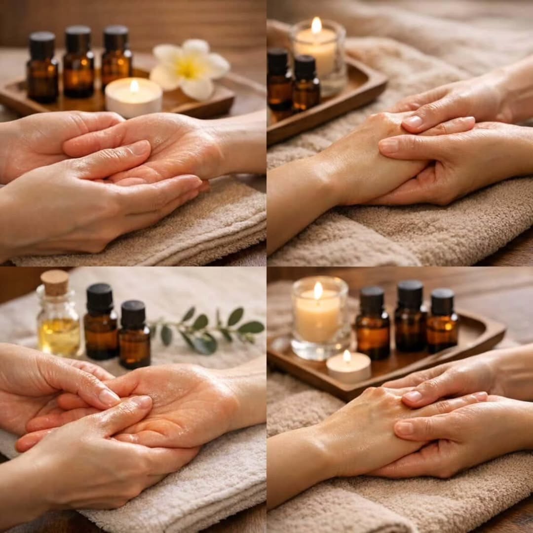 アロマの香りとやさしいタッチで、手からゆるむハンドトリートメントを行います。呼吸がふっと深くなり、短い時間でも心と体がほっと緩むケアです。10〜15分程度。どなたでも体験できます。