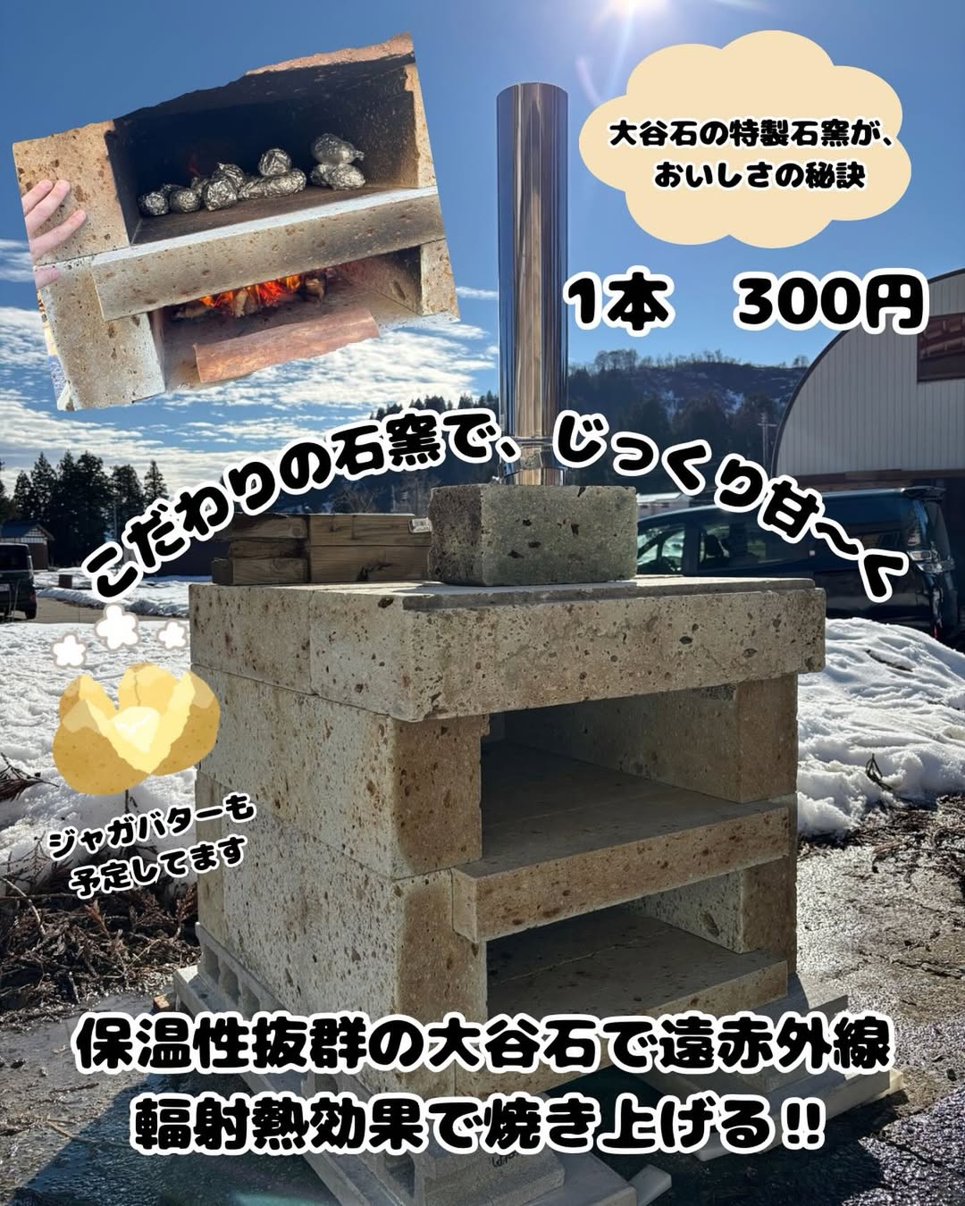 普段は石材店としてお墓づくりなどをしていますが、イベント当日は自社で製作した大谷石製の石窯でじっくり焼き上げた焼き芋を販売。じゃがバターも販売予定。(数量限定・なくなり次第終了)