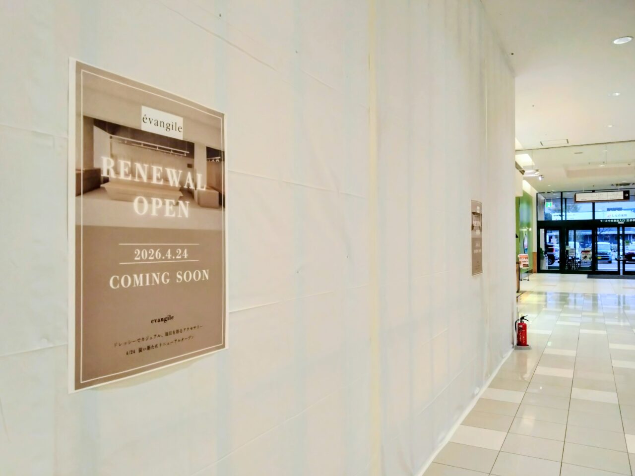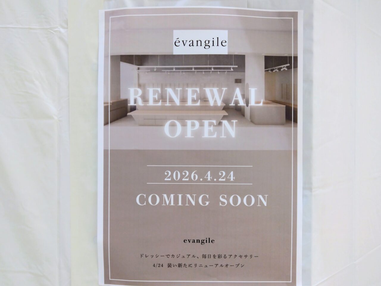 カジュアルアクセサリーショップ「evangile(エヴァンジル)リバーサイド千秋店」がリニューアルオープンのため改装中です。