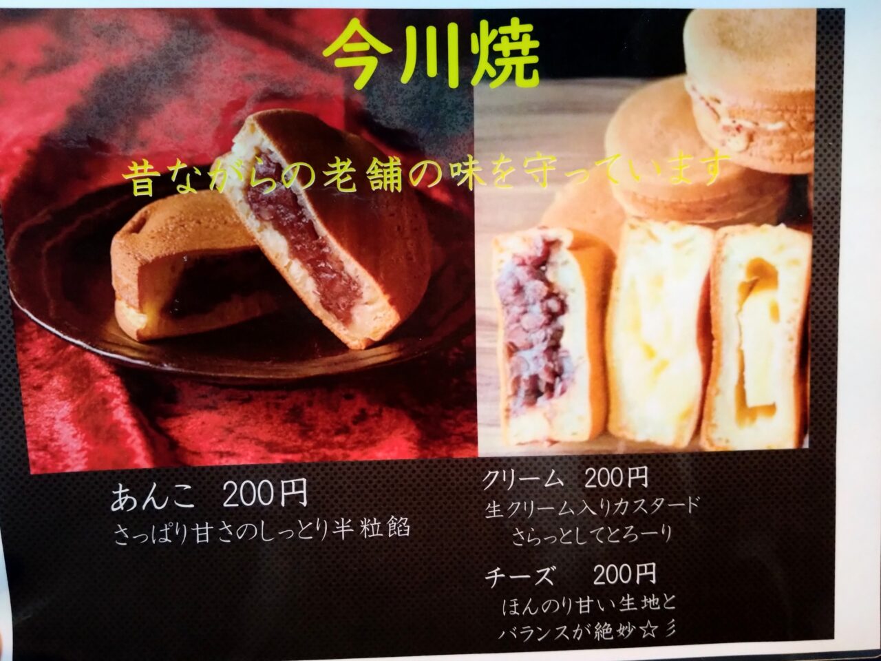 2026年4月現在、今川焼のメニューは「あんこ」「クリーム」「チーズ」の3種類。今後はどんどんメニューの種類も増えていく予定だそうです。