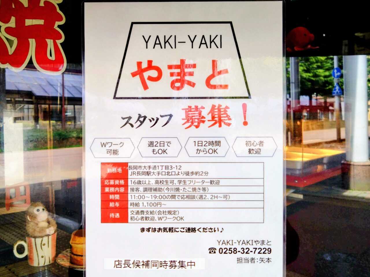 2026年4月現在「YAKI-YAKIやまと」ではスタッフを募集しているそうです。Wワーク可能、週2日間でも1日2時間からOK。初心者大歓迎とのことです。同時に店長候補も募集しているそうですよ。