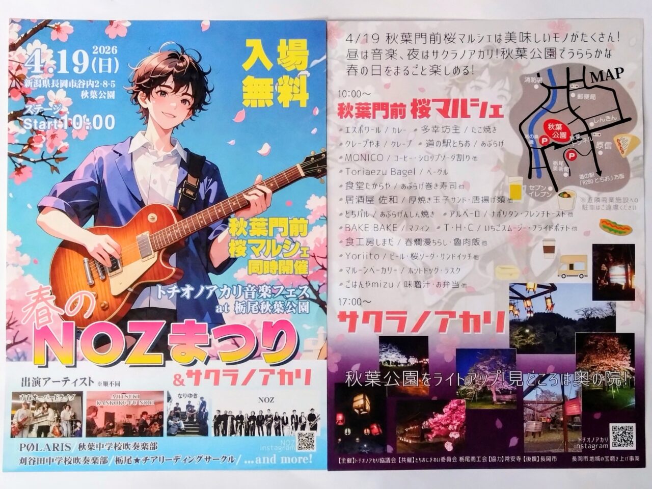 【長岡市】4月19日に栃尾秋葉公園で音楽にグルメ、ライトアップ!「春のNOZまつり」と「秋葉門前桜マルシェ」「サクラノアカリ」が同時開催。